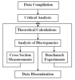 The evaluation procedure consists of the following generally established steps. Firstly, a search of the literature and of nuclear data bases is made to compile relevant experimental data. Data published only as graphs are digitized. Then, data from different sources are compared and the reported experimental conditions and errors assigned to the data are examined. Based on this, the apparently reliable experimental points are critically selected. Free parameters of the theoretical model, which involve appropriate physics for the given scattering process, are then fitted in the limits of reasonable physical constraints. The model calculations are finally used to produce the optimal theoretical differential cross section, in a statistical sense. Thus, the data measured under different experimental conditions at different scattering angles become incorporated into the framework of the unified theoretical approach. The final stage is to compare the calculated curves to the experimental points and analyse the revealed discrepancies. If no explanation for any disagreement can be found, then a new measurement of the critical points should be made. The following scheme outlines the procedure.
